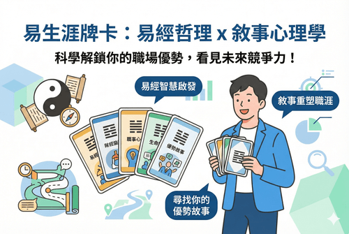「易生涯」是一套把《易經》智慧帶進職涯與人生設計的實務方法。它不是要幫你「算命」,而是用變化、陰陽、時機等概念,陪你重新看見自己所處的位置與正在面對的關卡。透過卦象牌卡、自然意象與敘事提問,諮詢師會引導你說出自己的故事:現在的工作處遇?生命裡有哪些重要他人正在影響你的選擇?你最在意、卻常被忽略的是什麼?透過諮詢師引導,讓案主看見更多可能的路徑。最終的目的,不是預測命運,而是幫助你在變動的世界裡,看懂自己的節奏與方向,找到那股願意再次出發的內在驅動力。